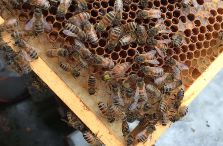 Bei der Durchsicht haben wir festgestellt, dass die Königin bereits Eier gelegt hat. Auf dem letzten Rahmen haben wir bereits verdeckelte Brut festgestellt.