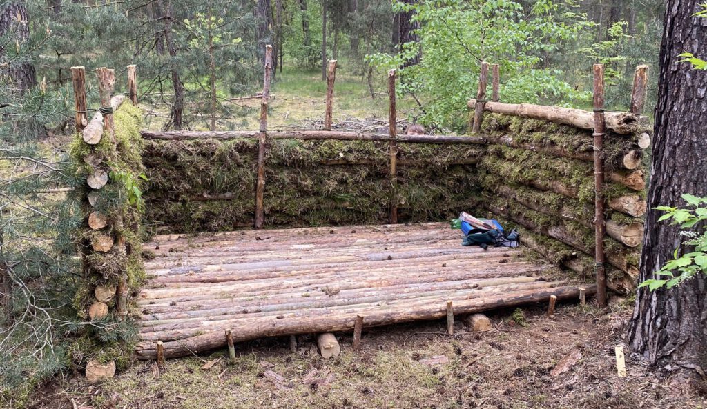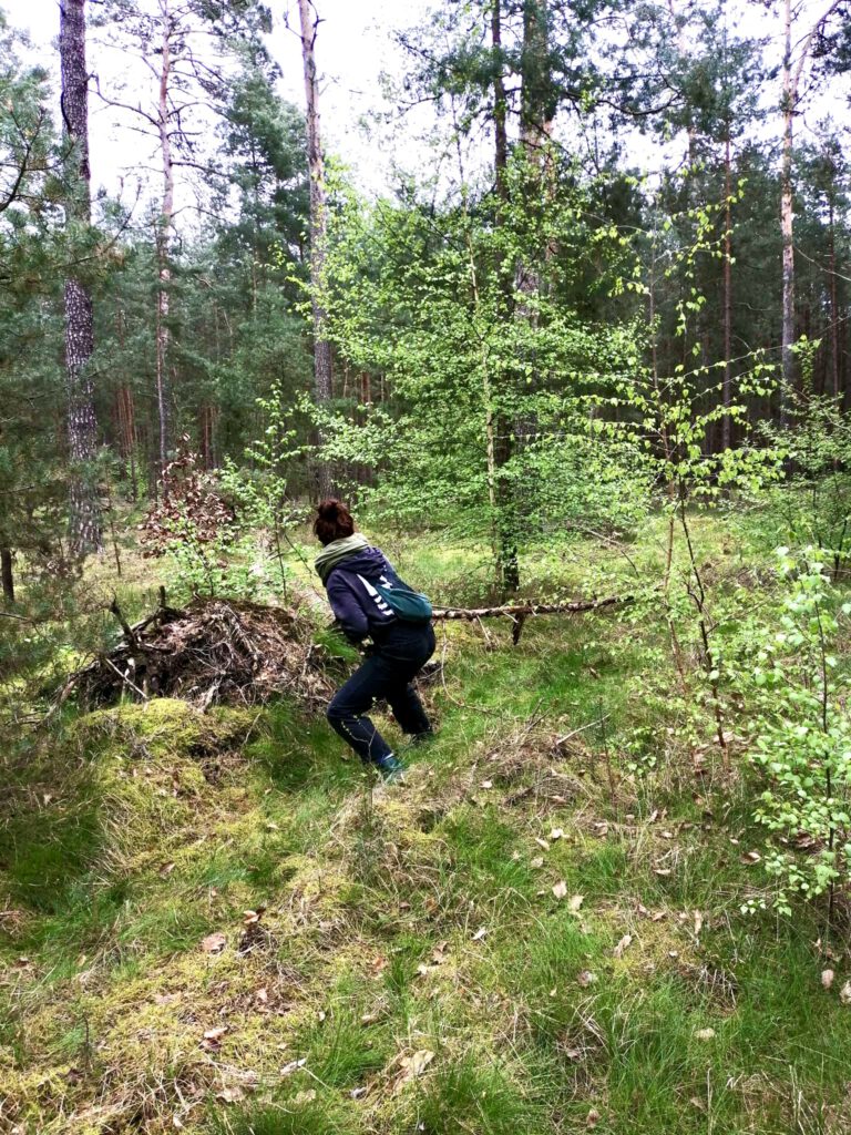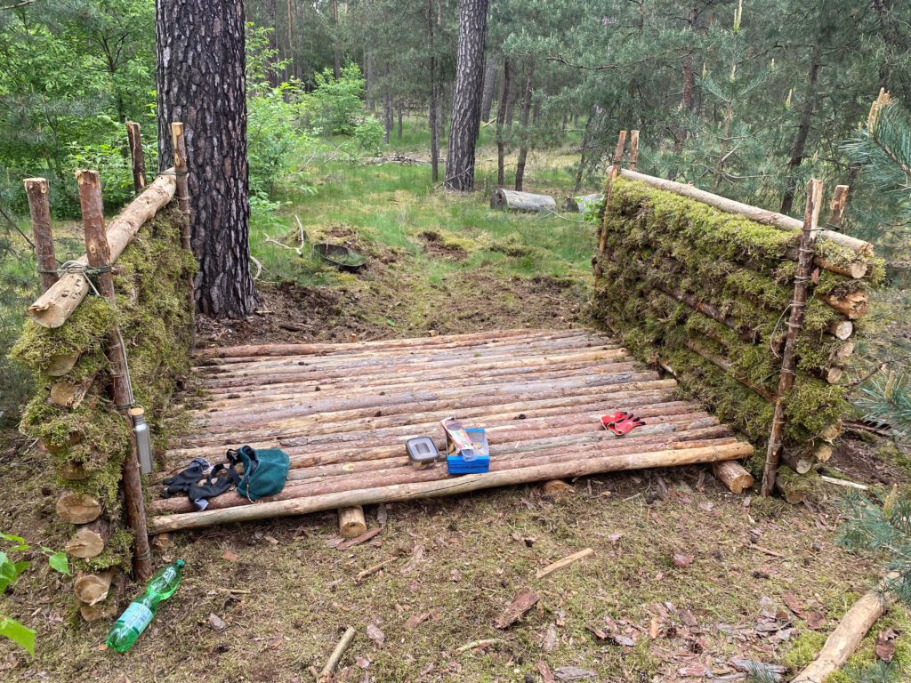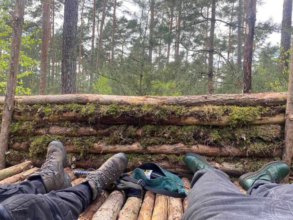 Am ersten Tag lag die Aufgabe darin, nach einem geeigneten Platz für unser Camp zu scouten. Dafür sind wir durch den Michendorfer Wald gestapft und haben uns ein paar Plätze angeschaut, die in Frage kommen könnten. Ein Platz war für unseren Geschmack zu nah am Weg oder wurde von einem Hochstand observiert. Bei einem anderen waren sehr viele Spinnen unterwegs, die wir nicht zwingend stören wollten 🙂