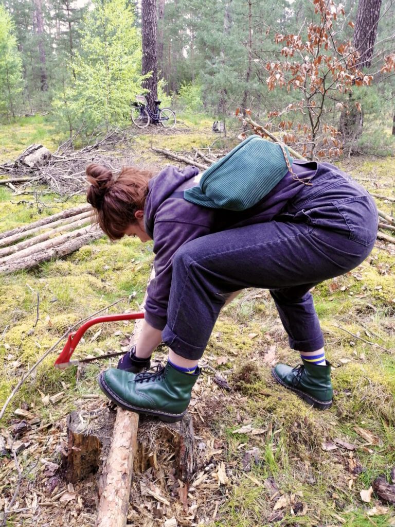 Als wir eine gute Menge Material zusammen hatten, begann Jo mit der Axt die noch übrigen Äste zu entfernen und Lotti hat mit der Säge alle Bäume auf Maß gesägt. Wir haben abgesprochen, dass wir mit dem „Bett“ beginnen wollen. Da wir beide circa 180 cm groß sind und wir am Fuß- oder Kopfende noch Platz für Rucksäcke oder anderen stuff lassen möchten, haben wir uns auf eine Länge von circa 250 cm geeinigt. Bei der Auswahl der Bäume für unser Bett haben wir darauf geachtet, dass sie nicht allzu morsch sind und keinen geringeren Durchmesser als 5 cm haben.