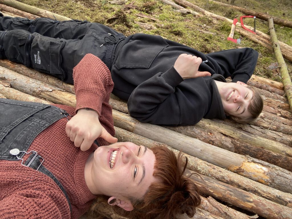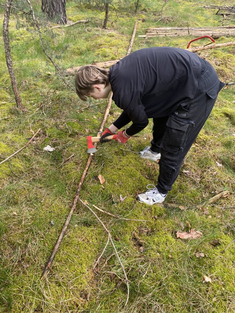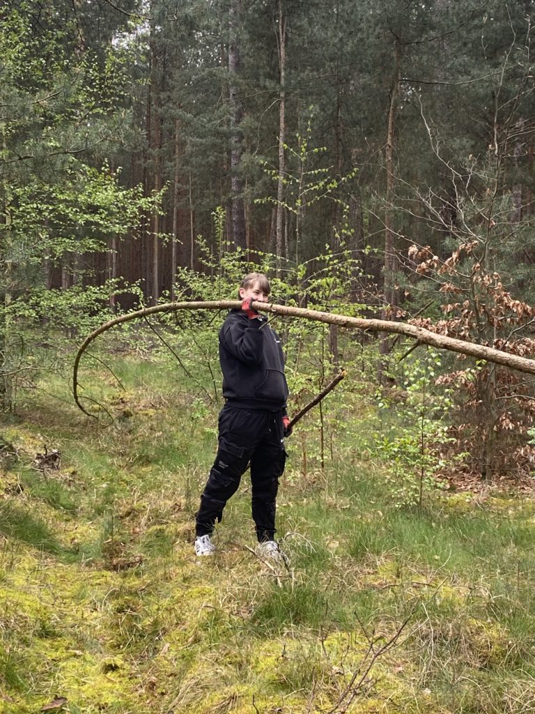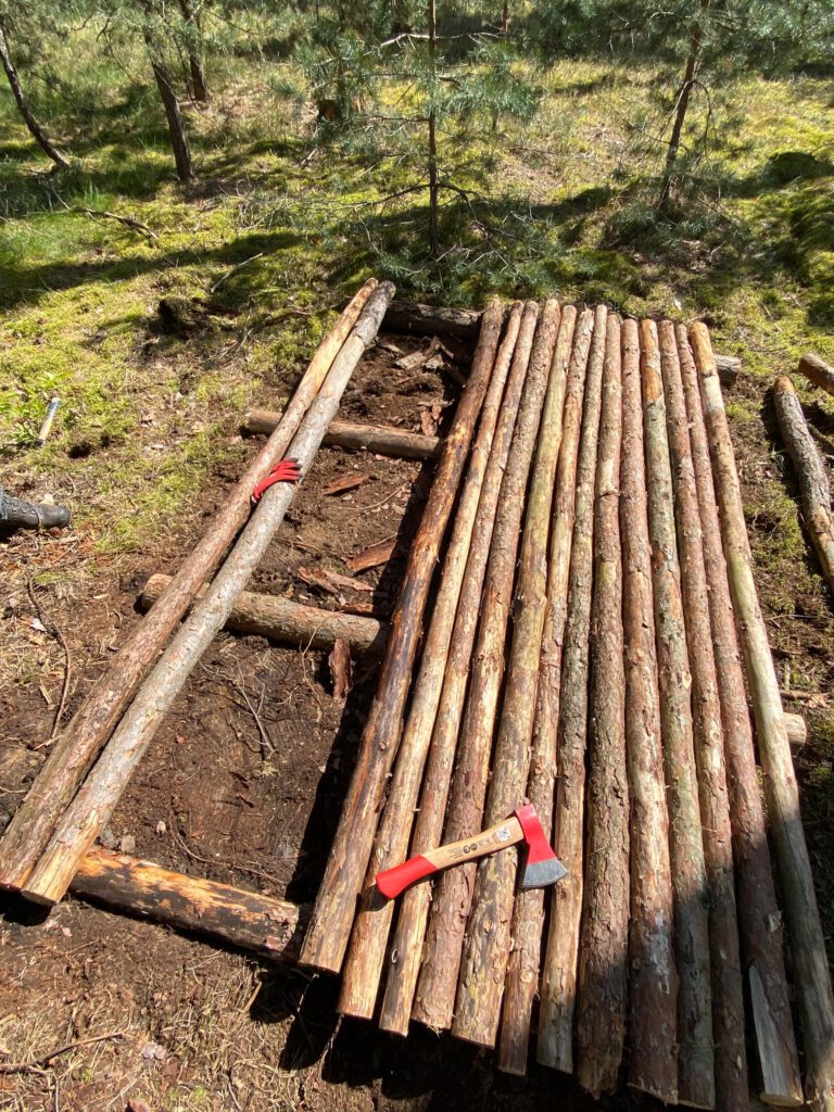 Unsere Hauptaufgabe für den Tag bestand darin, dicke Stämme auszuwählen und für den Bau der Wände unseres Shelters vorzubereiten.