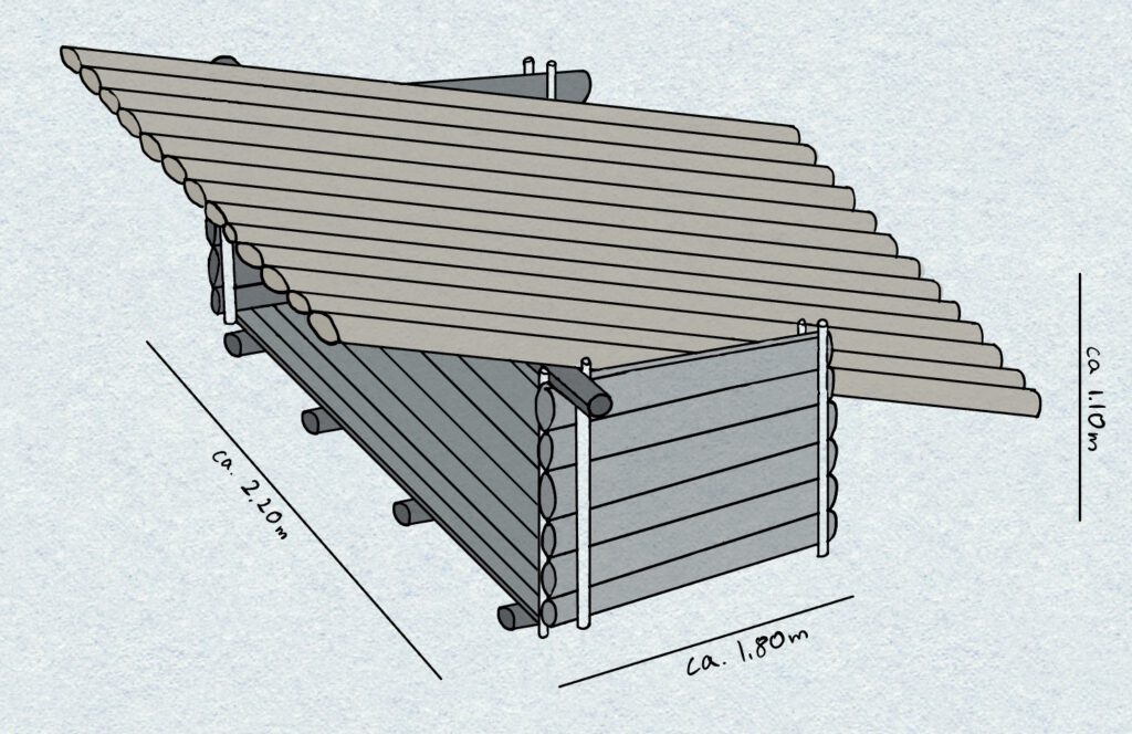 Nun steht der nächste Schritt an: Beim nächsten Treffen müssen wir uns überlegen, wie wir das Dach dicht bekommen. Zwischen den Stämmen sind noch teilweise große Lücken, die wir schließen müssen, um einen effektiven Schutz vor Wind und Regen zu gewährleisten.