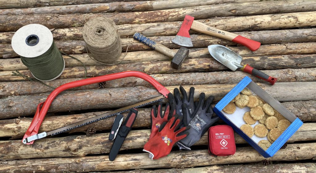 Paracord, Hanfseil, Hammer, Axt, Schaufel (+Spaten), Säge, Multitool, Messer, Handschuhe, Erste-Hilfe-Set und natürlich ganz wichtig das darf absolut nicht fehlen: schwedische Haferkekse.
