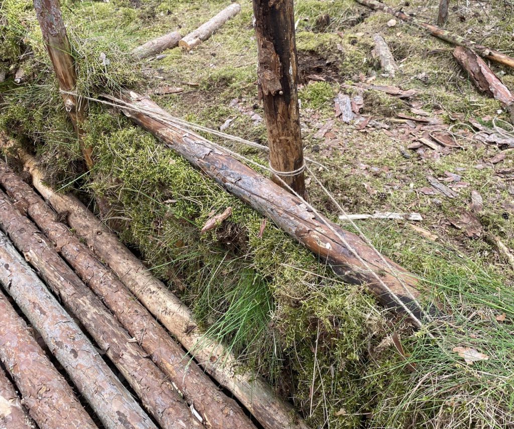 Danach schichteten wir abwechselnd einen Stamm und Moos zum Verdichten. Zwischendurch befestigten wir die Pfeiler mit Hanfseil an beiden Seiten, damit uns nicht das Gleiche wie beim letzten Mal widerfährt. Die dünneren Stämme hatten zu viele Zwischenräume geschaffen, weswegen die nächsten Stämme durch das Gewicht nach unten rutschten. Durch das Hanfseil füllten wir die Zwischenräume aus, damit der nächste Stamm auf dem Hanfseil liegen konnte. Ab und zu spannten wir die Pfeiler erneut mit dem robusteren Paracord, damit sie weiterhin schön stabil blieben. Viele Stämme benötigten auch viel Sägen und viel Schleppen, doch die Mühe machte sich bezahlt.