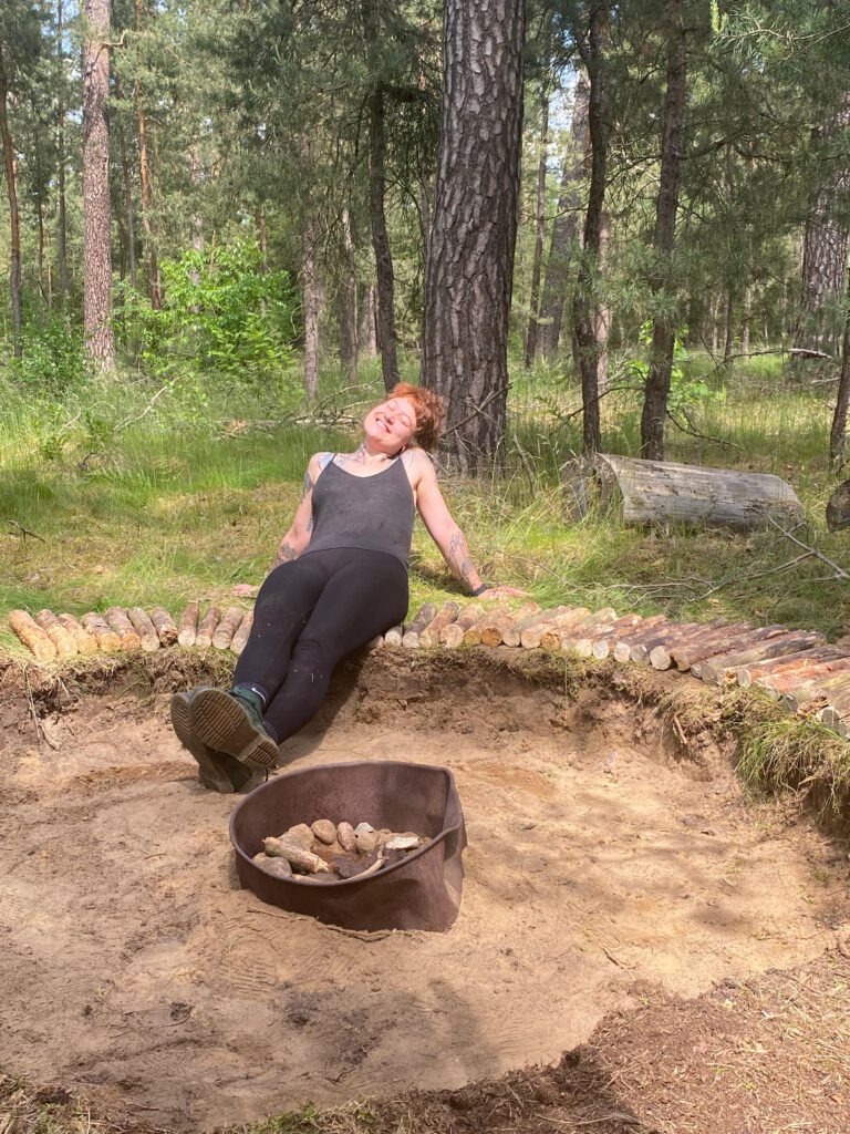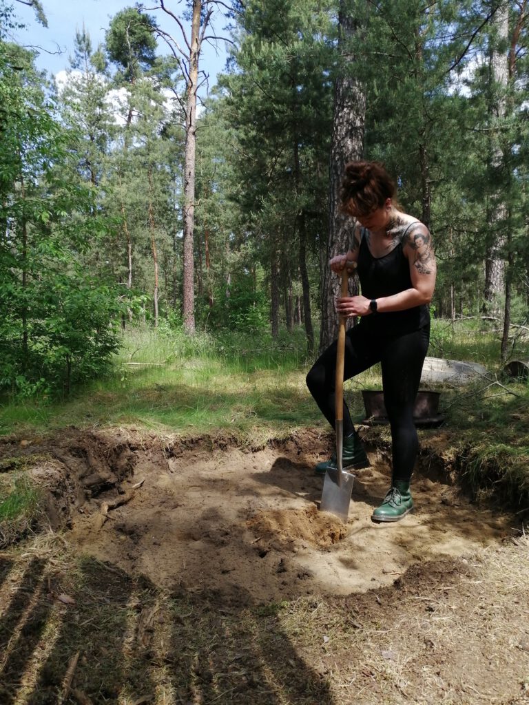 Da noch die Idee des Feuerplatzes im Raum stand, war das also die Aufgabe für heute. Wir brachten sogar zwei Spaten mit, was auf den Fahrrädern gar nicht so einfach war. Sie erleichterten uns aber vieles, da wir einen großen Kreis ausbuddelten, was es uns ermöglicht am Rand des Feuers zu sitzen.