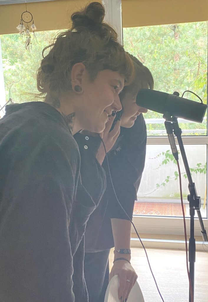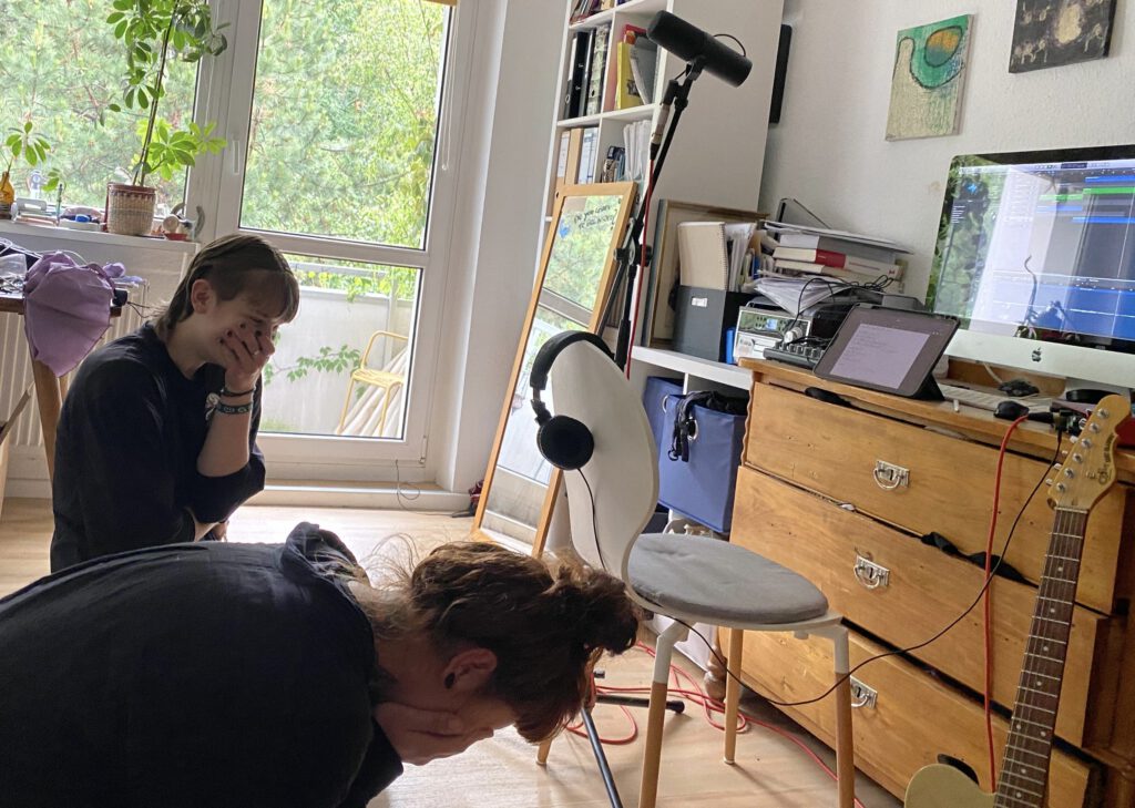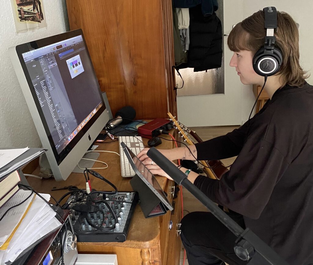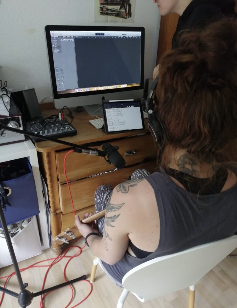 Danach ging es auch schon los und Lotti spielte die Melodie mit der Ukulele ein, die sie sich dazu ausgedacht hatte. Hinterher spielte Jo ein paar dazu passende, melodische Klänge ein und das Grundgestein war erschaffen!